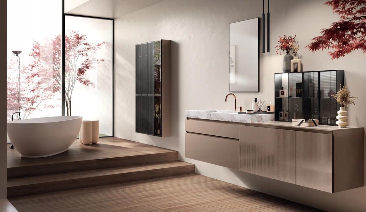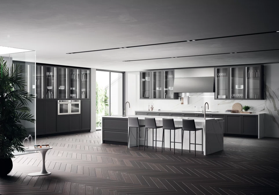 A sleek, Italian-inspired showroom in Orange County showcasing high-end kitchens, bathrooms, living areas, and modular home solutions. Scavolini Store Laguna is dedicated to helping clients design their dream homes with daily commitment and style.